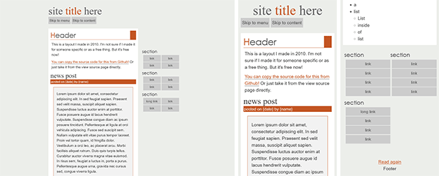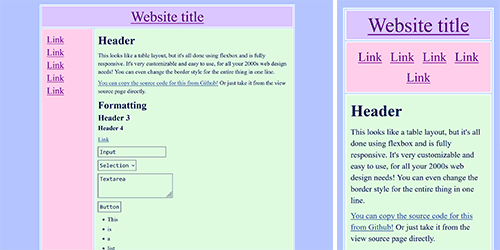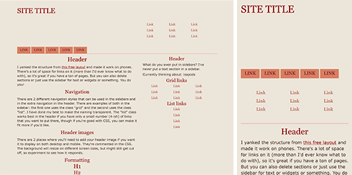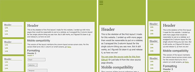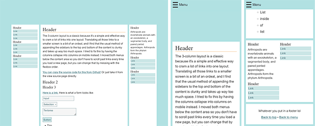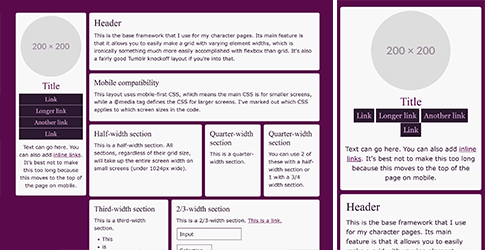 All the layouts here work regardless of screen resolution, including phones, and can be zoomed in and out of without breaking anything. I generally consider them to be templates, so you'll likely need to do some degree of modification to use them. (Of course, you're also free to use them as-is if you like the default styling!) There are Github "download" links so you can copy the code more easily, or you can just copy the source code in most instances. I'm available for technical support if needed (email me)