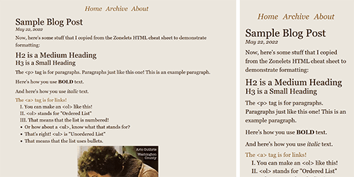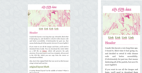 Pretty minimal - there's room for a banner and a sidebar. That's it! There are 2 versions, which look the same on desktop but behave differently on mobile. Version 1 stays in 2 columns regardless of screen size, while version 2 turns into 1 column and gets a hamburger menu on phones and small screens. The icons for the hamburger menu can be downloaded on the snippet page, or you can make your own .svg files to use!