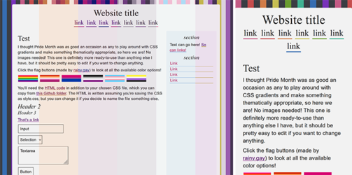 A layout and a collection of CSS themes based on pride flags, using CSS gradients for the backgrounds (no images)! These are plug-and-play but still fully customizable. They have a light and dark toggle built in.
