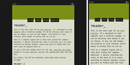 The layout of my UTAU website, loosely fashioned after a terminal window. It works best if you're not planning on putting too many links in the menu. It has space for a banner, and there's built-in light/dark mode.